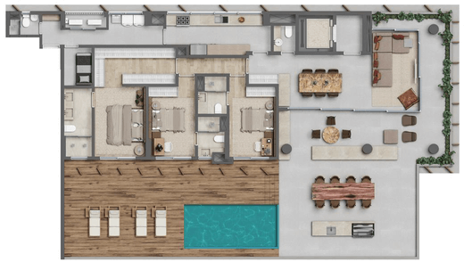 Nessa unidade de 319m² há disponíveis 3 amplas suítes, salas de jantar e estar integradas e uma generosa varanda (terraço). As possibilidades são interessantes para quem gosta de personalizar sua própria casa, do seu jeito.